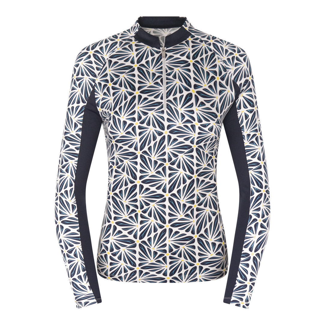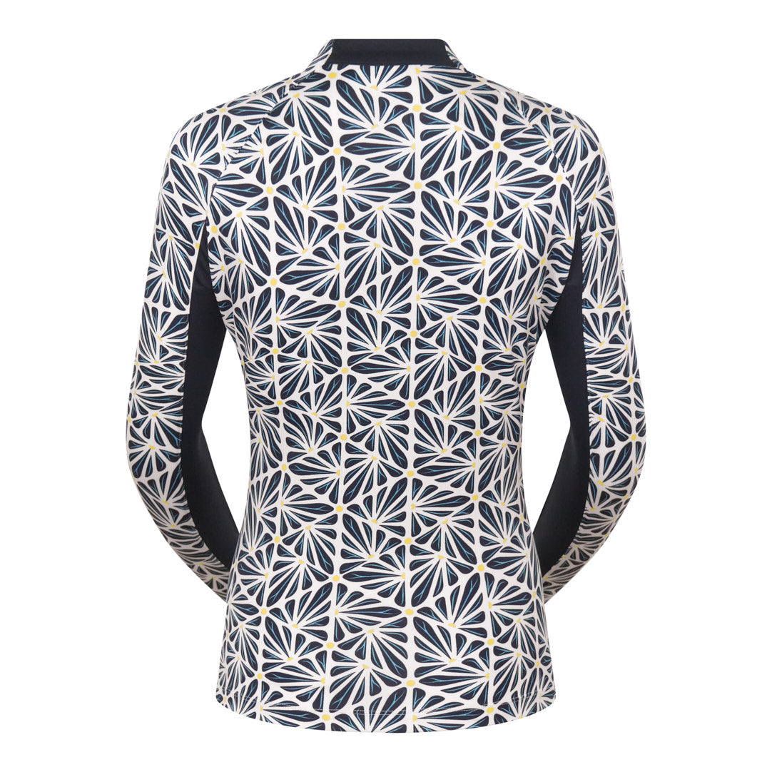 This long sleeve quarter-zip top, adorned with a Gemstone Geo print in shades of Night Navy, Chalk White, Aquarius Blue, and Aspen Gold, showcases a stunning silhouette on the golf course. The featured funnel neck and side inserts, crafted with high-quality Performance Jersey material, provide moisture-wicking and UPF 50+ protection to keep you cool, dry, and shielded from the sun's harmful rays. Measurements reach 25" in length for size Medium. Fabric composition is 91% Polyester and 9% Spandex.