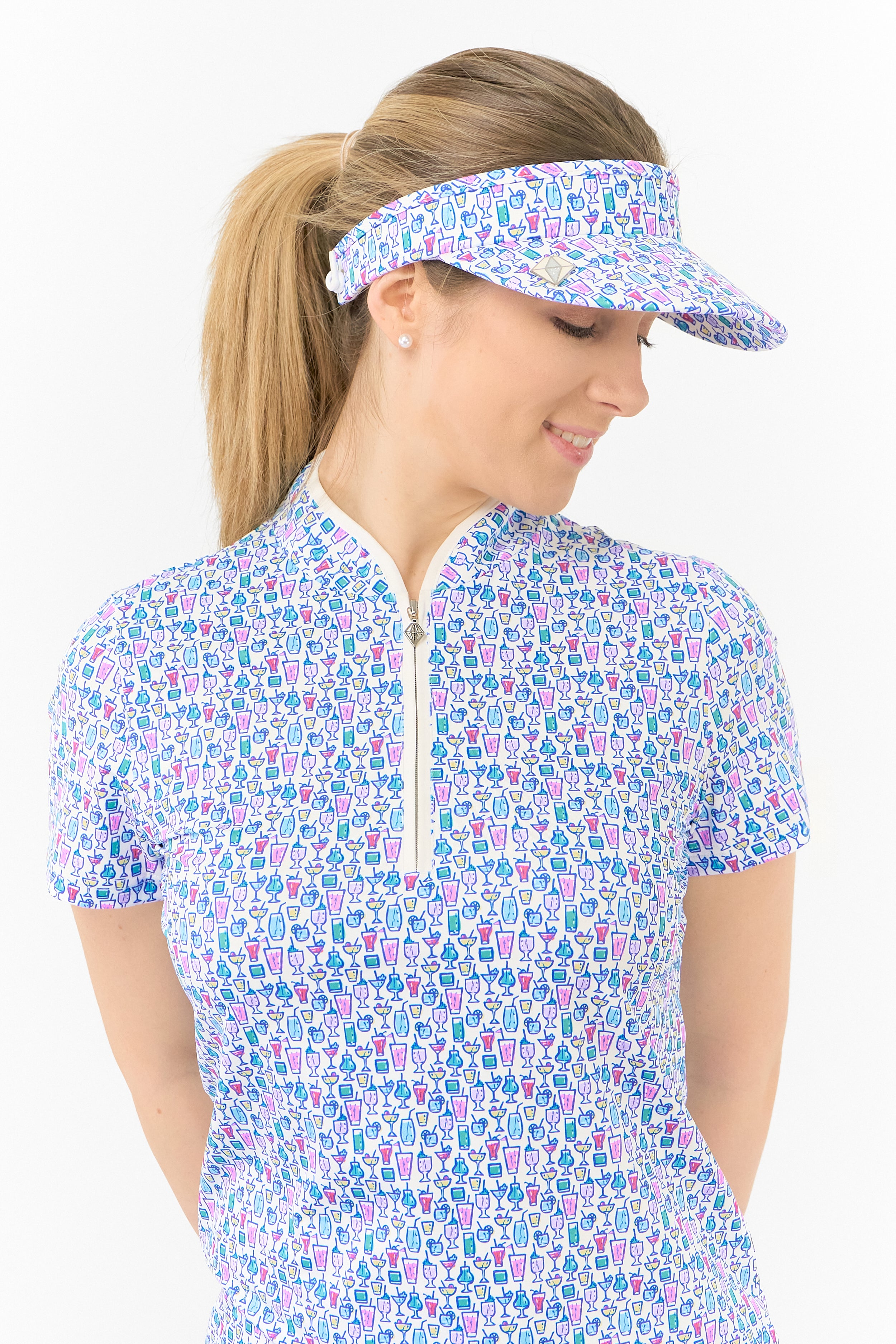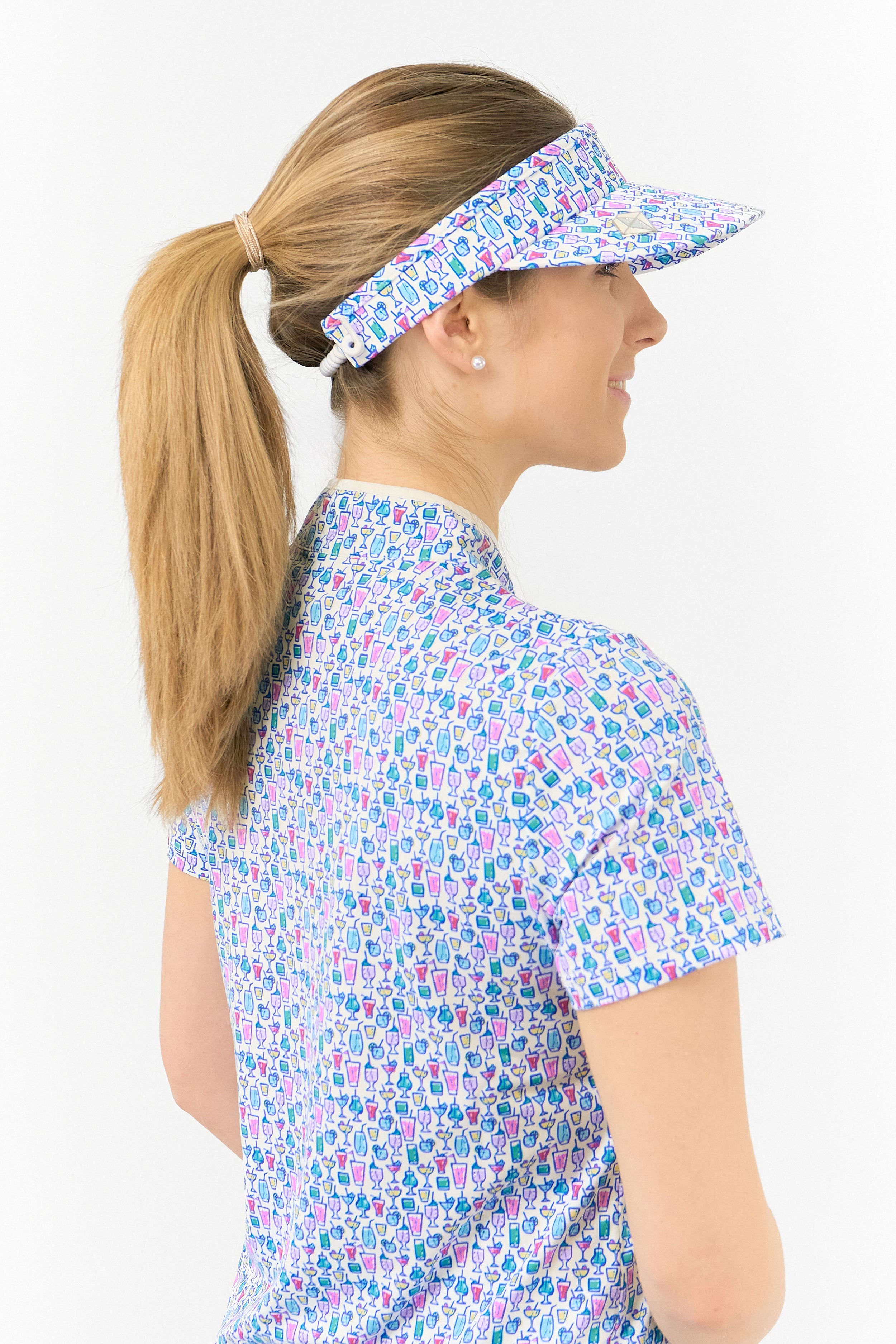 Our Pure Golf Arielle Telephone Wire Boozy Over Eighteen Woman Golf Visor features a distinctive print of cocktail motifs in soft pastel hues. This one-size-fits-all visor is designed to be both functional and stylish on the course. With an elasticated cord at the back for a secure and comfortable fit, it's the perfect accessory for any golfer. Explore the features that make it an essential addition to your golf outfit.