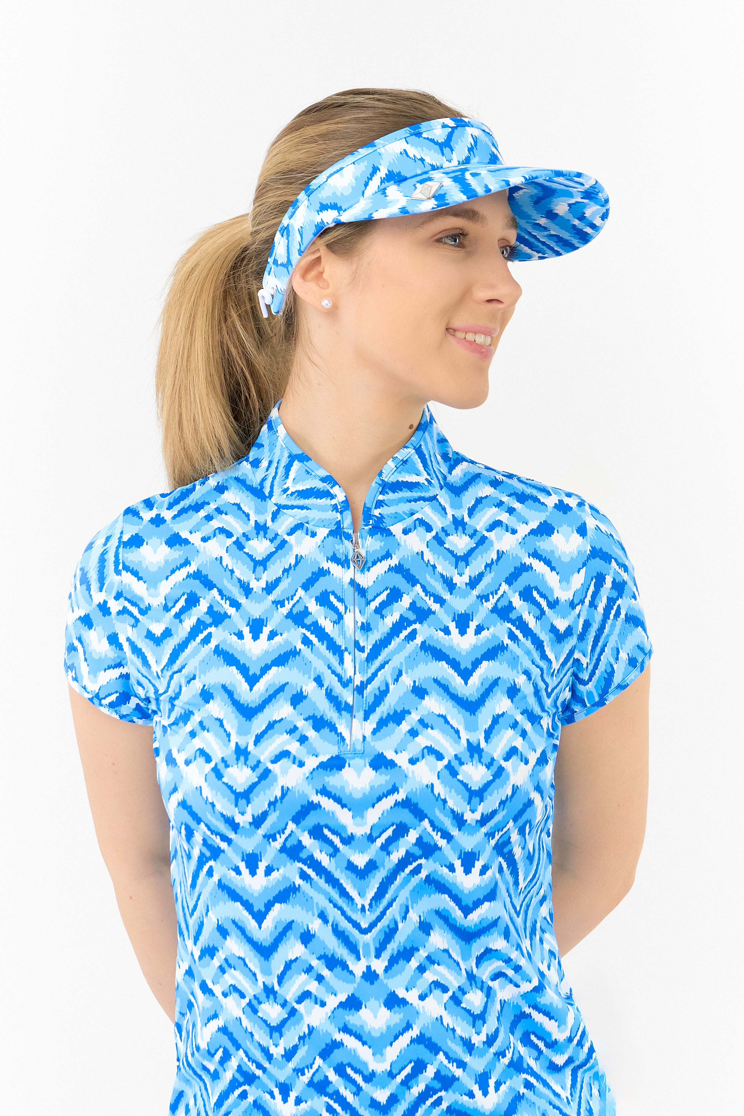 This telephone Wire Santorini Skies Woman Golf Visor showcases a Ikat-inspired blue print, drawing inspiration from a Grecian Summer. Watch our short video showcasing this beautiful print by clicking here. This one-size-fits-all visor is designed to offer both style and functionality on the course. The elasticated cord at the back ensures a secure and comfortable fit, making it the perfect accessory for any golfer.