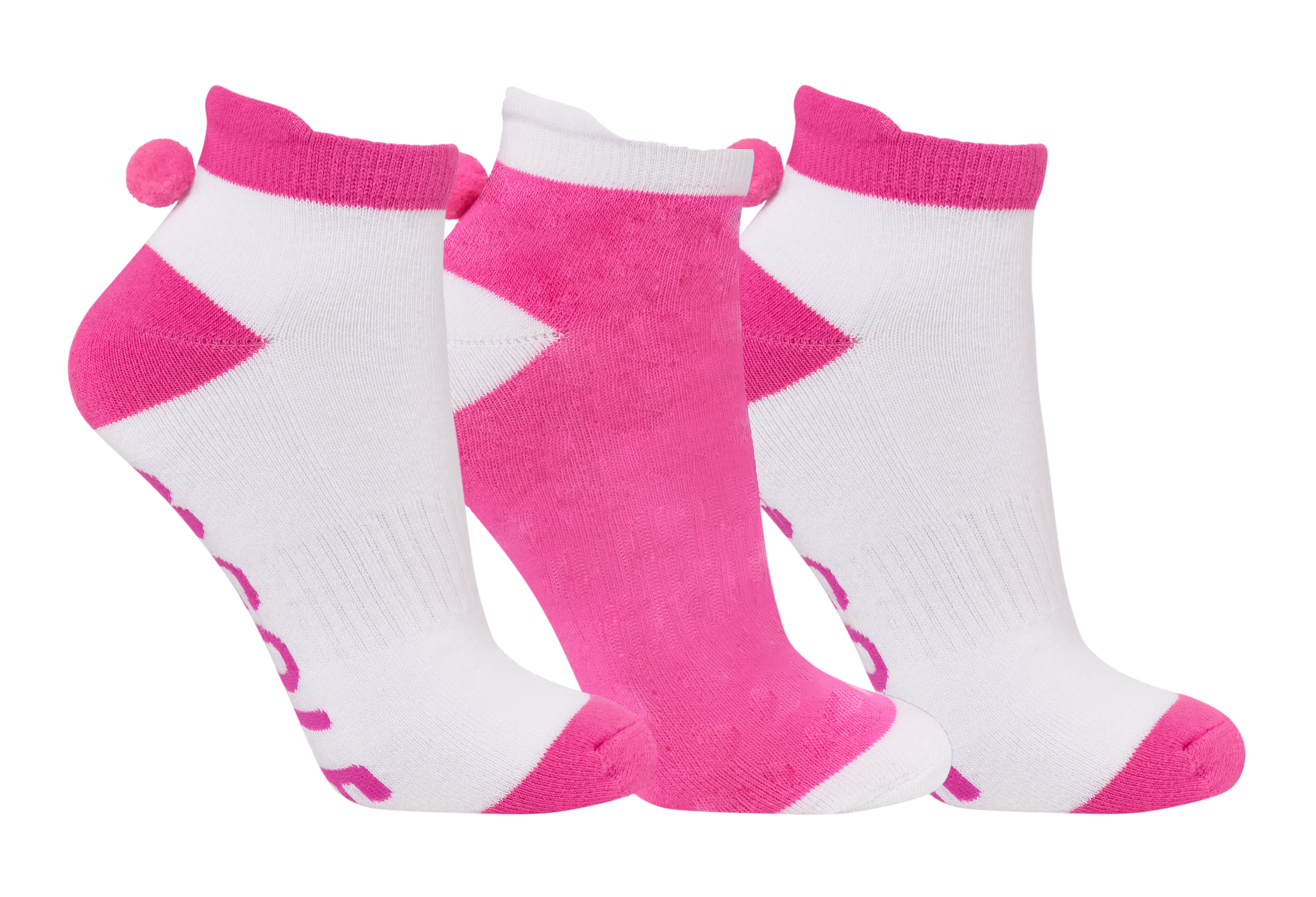 This 3 pack of Ladies ankle Golf socks have a co-ordinating colour pom pom on the heel to help the socks hold their position. With a cushioned sole and compression fit, for maximum comfort as you play golf or around town! Made from a soft, stretchy cotton blend fabric that gives you improved support for your foot. This fabric blend also has great breathability, allowing air to circulate so your feet will feel dry and comfortable whilst not getting sweaty. These Golf Socks won't lose there shape even after many washes. Perfect for the summer months. They are suited to UK sizes between 4 and 7.