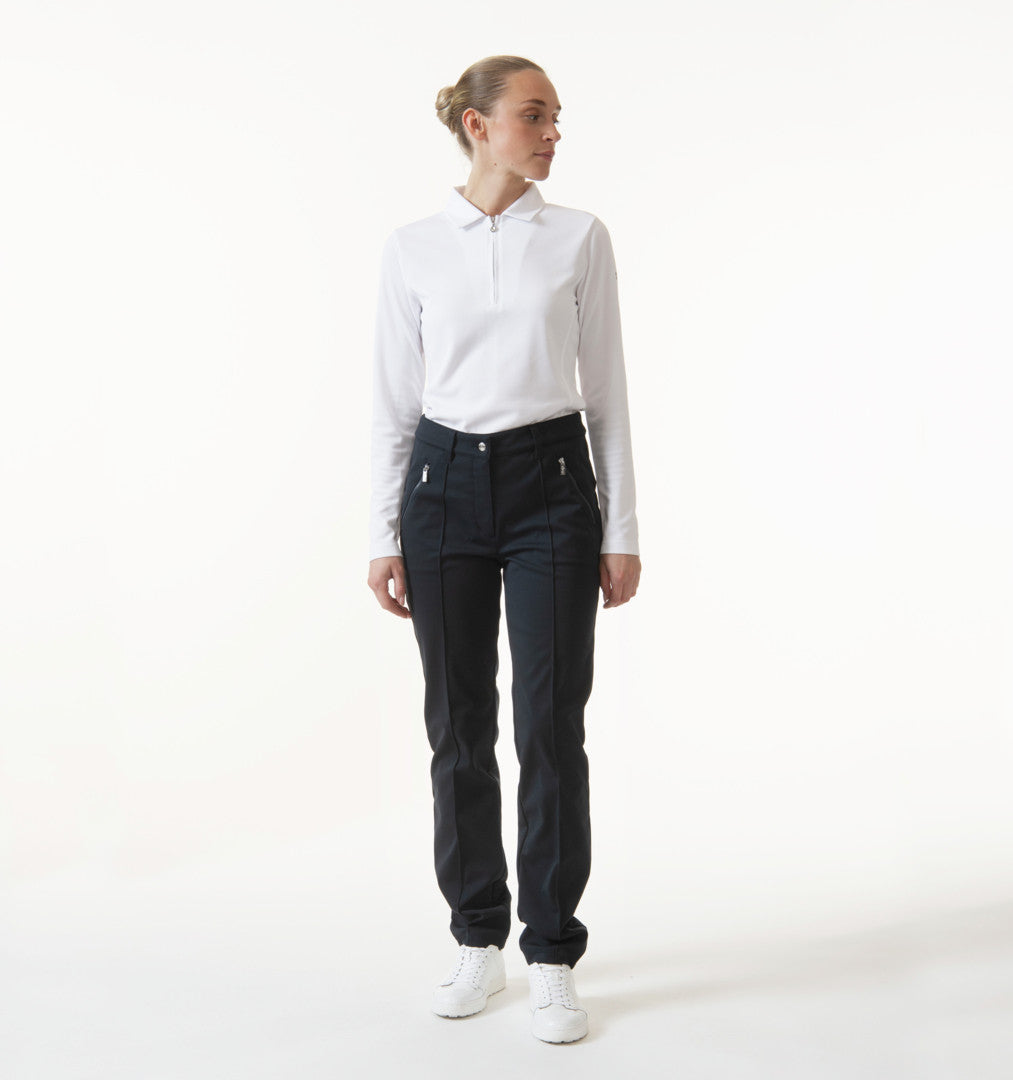 The softshell fabric allows for free movement, and the elegant design features a high waist, stitched creases, and three pockets. Tackle the course with confidence and style.