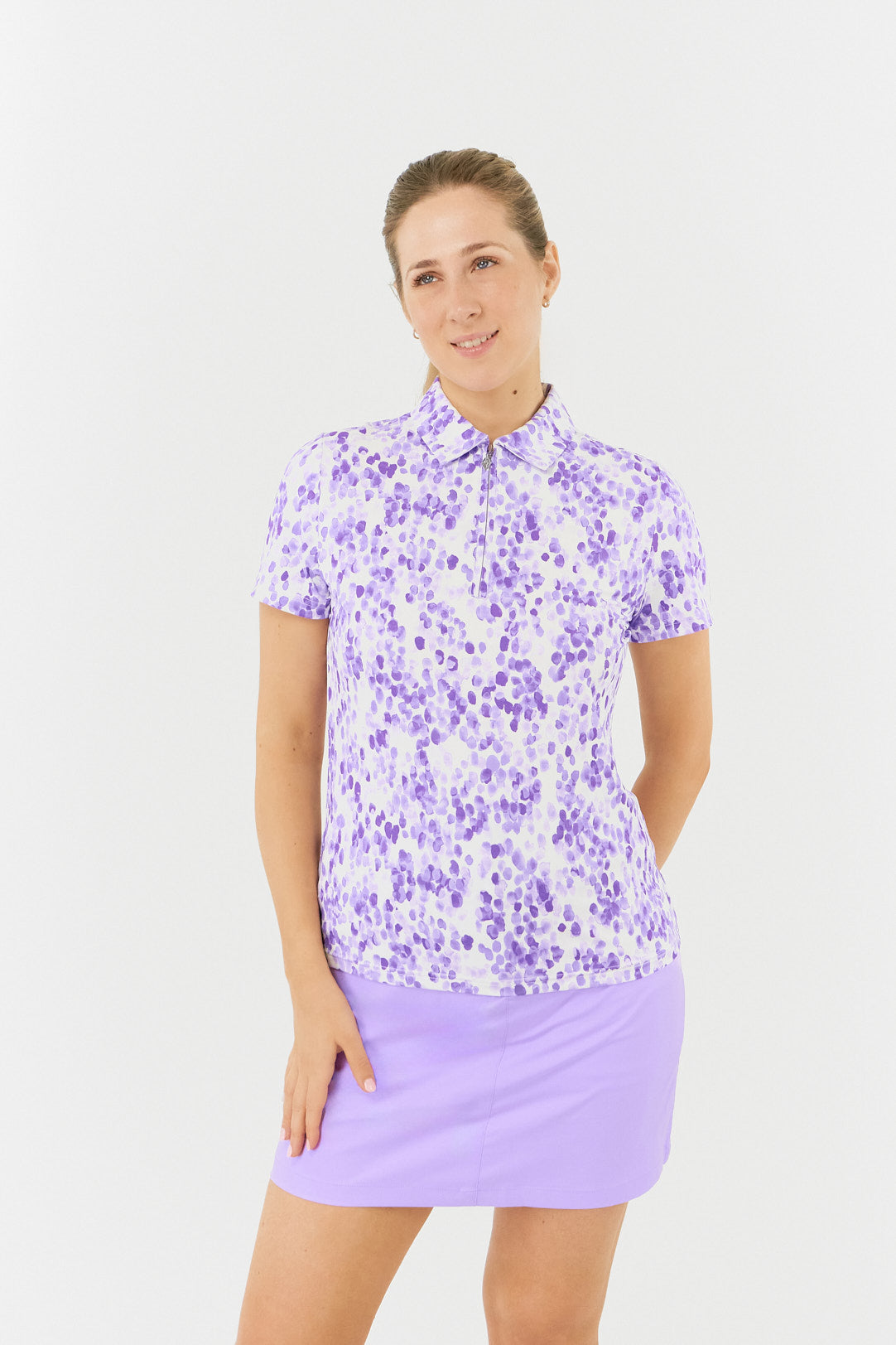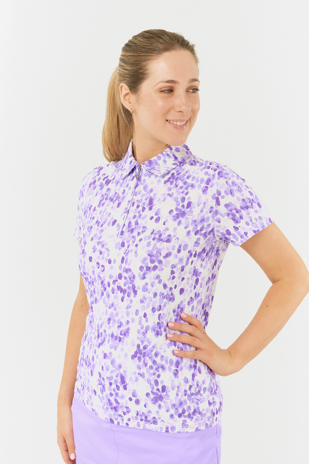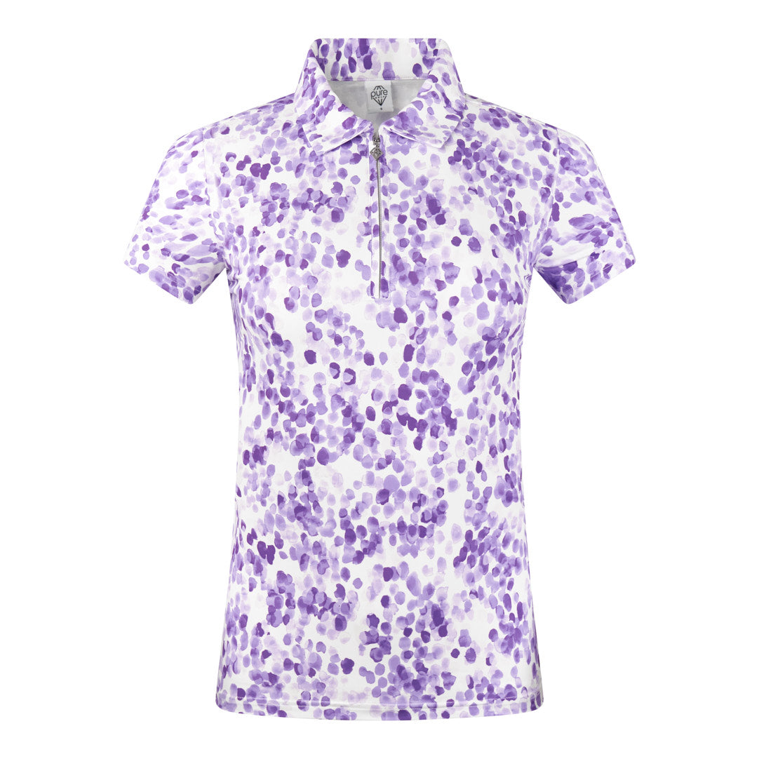 Elevate your golf game with the Pure Golf Amity Ladies Short Sleeve Polo Shirt - Violet Fields. These soft and refreshing lilac shades will give you a springtime vibe.