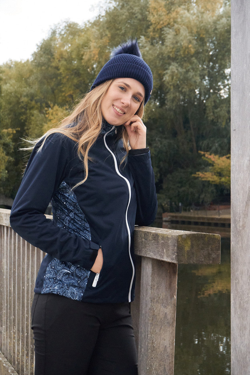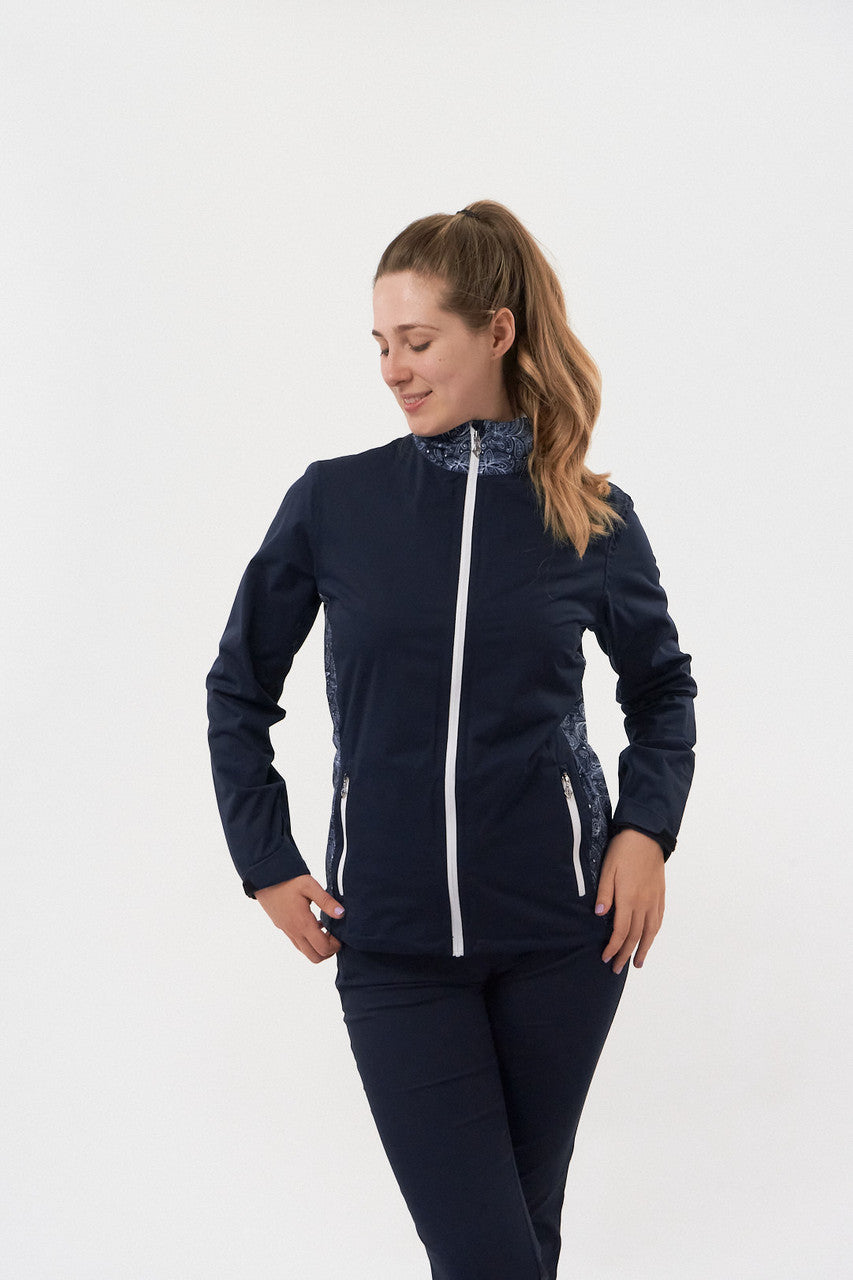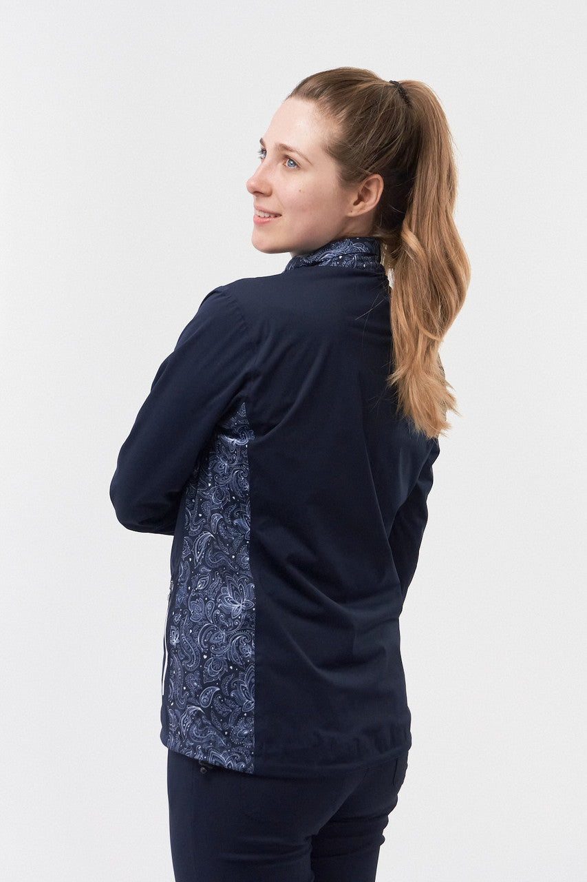This unique design has a paisley motif on the neck and side panels, with white front and pocket zippers and a Navy base on the body.