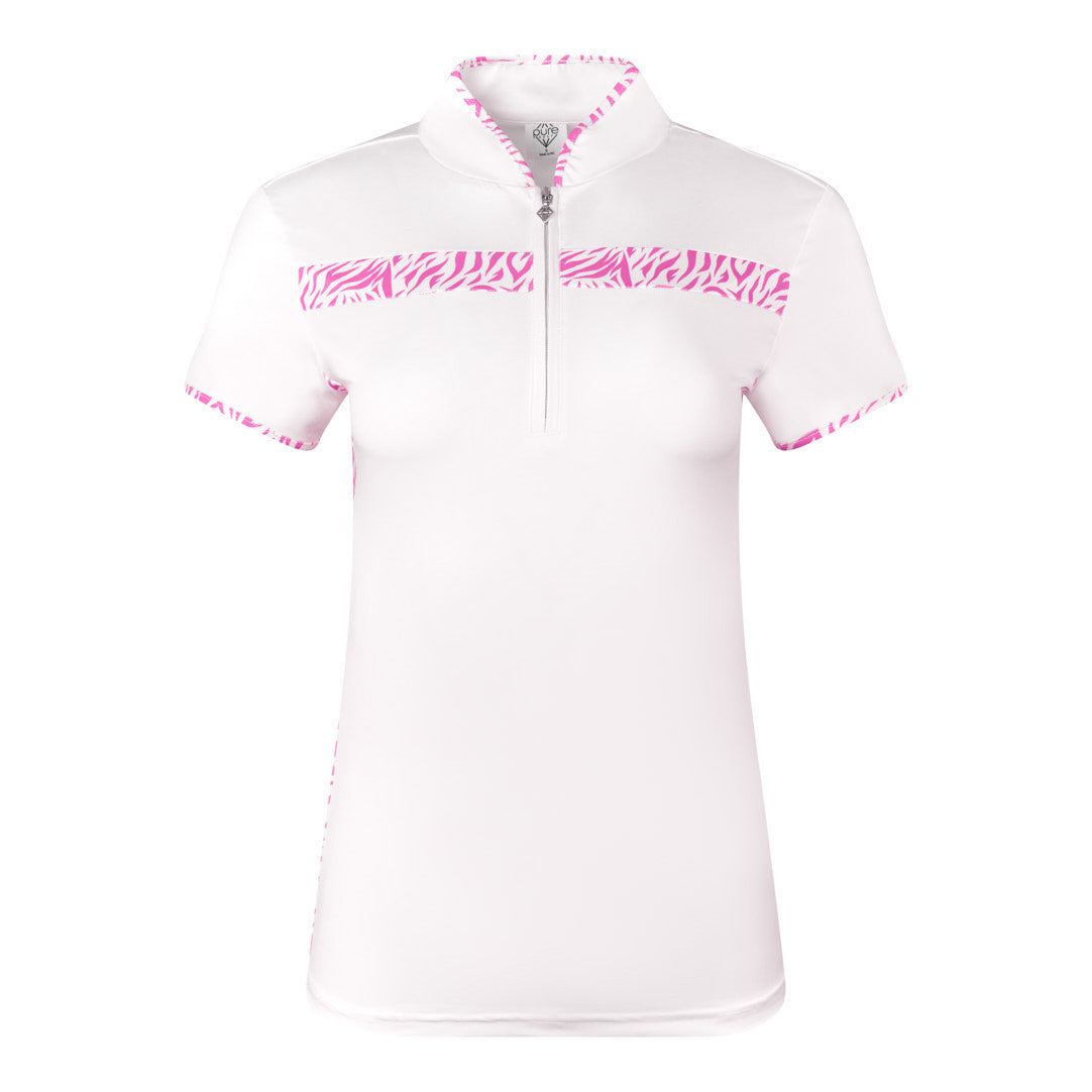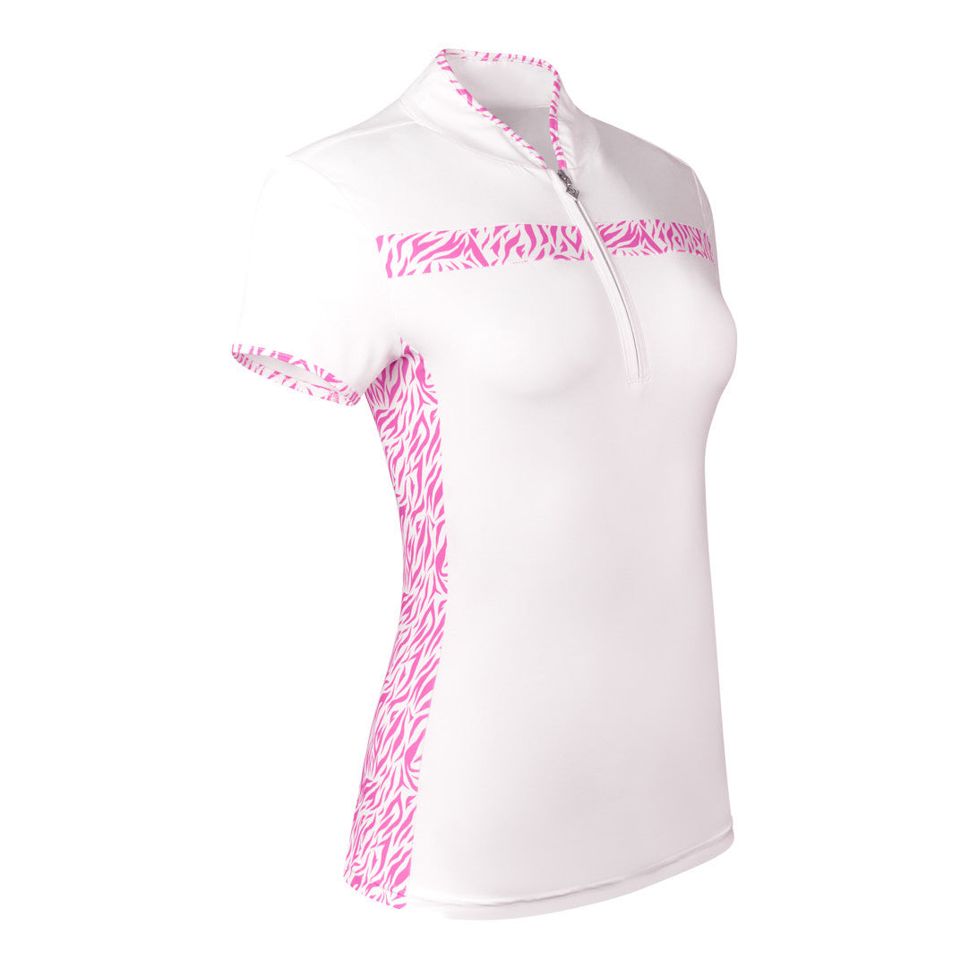 Keyana is a versatile partial print, cap sleeve zip top made from anti-static, anti-crease, 4-way stretch, and quick-drying fabric with built-in UVA+UVB sun protection with UPF 35 to block harmful rays on the course. Looks great worn with either plain bottoms or a patterned skort subject to the wearer's taste. Deliberately designed to integrate seamlessly with the Azalea Zebra fashion collection and Azalea Pink and white pieces from our Essentials range.