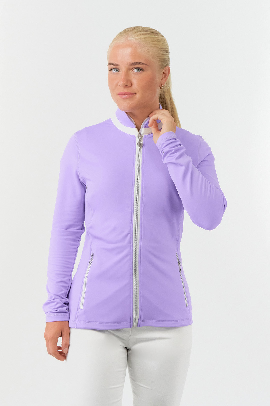 Elevate your golf wardrobe with the addition of this mid-layer jacket. Crafted with a soft and lightweight fabric, it won't crease and can be conveniently stored in your golf bag. The lilac color adds style to any look, and can be personalized with embroidery upon request. Versatile for any sport or casual wear.