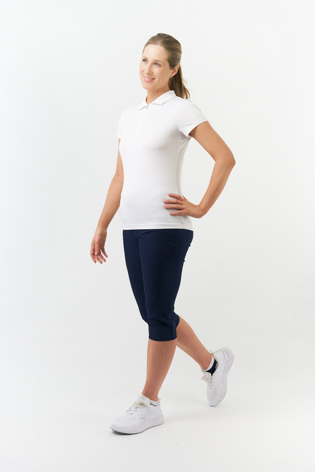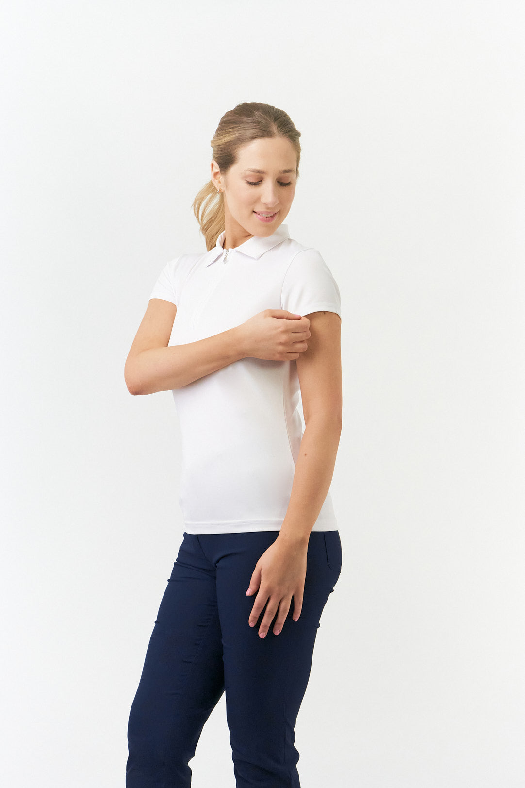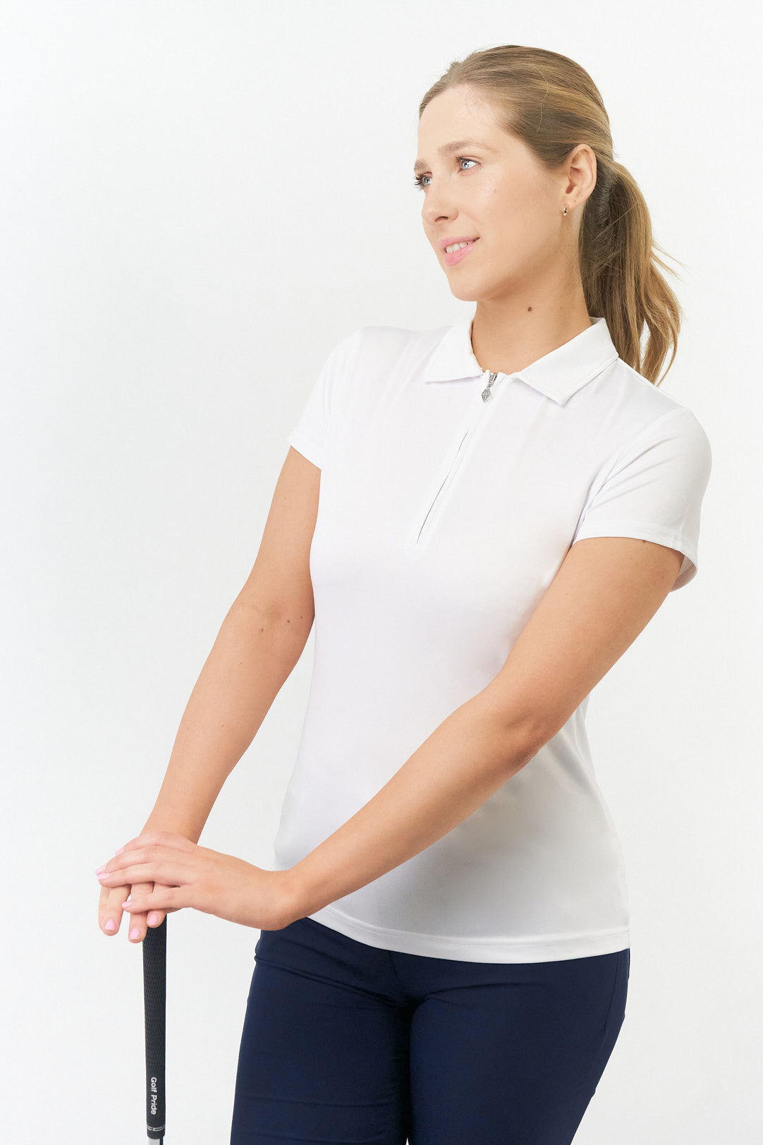 The Thrive cap sleeve women's golf polo shirt is a new additional to the Pure Golf Essentials collection. It features a delicate traditional collar and quarter zip fastening in a regular fit. Made from quick dry material with sun protection built in, anti-static and anti-crease properties, this polo shirt offers both comfort and functionality. Its four-way stretch fabric ensures full freedom of movement for a comfortable fit. Available in a range of essential colors, the Thrive ladies golf polo shirt is the perfect option for creating a coordinated, top-to-toe look. With our in-house embroidery capabilities, we can personalize it for you. Pure Golf has been voted Brand of the Year by lady golfers themselves, a testament to our high-quality and flattering range of golf clothing for women at all levels.