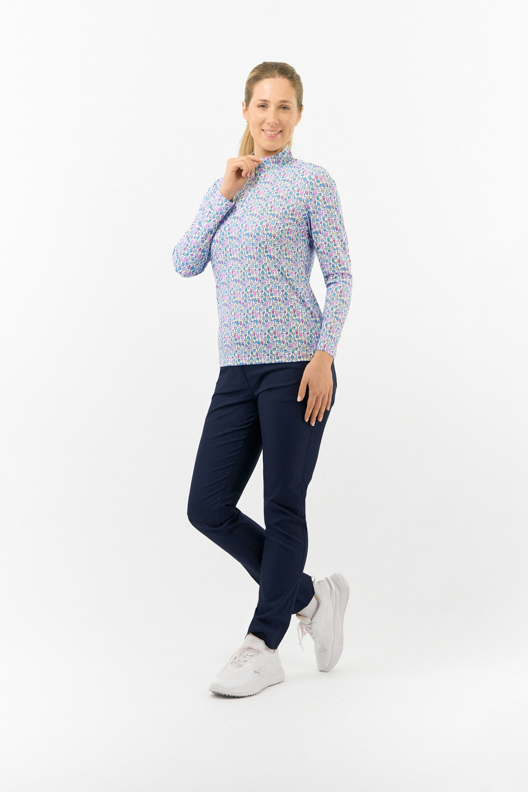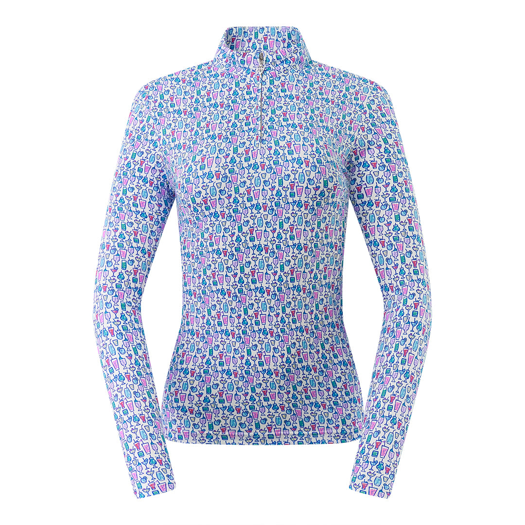 Introducing the Serenity Long Sleeve Ladies Golf Zip Top, showcasing the Over Eighteen Boozy print. A playful choice for women's golf attire, this full zip top boasts delicate cocktail designs in soft hues. Versatile enough to wear alone or as a layer, it offers numerous features to enhance your golfing experience. Elevate your wardrobe with the coveted Serenity Long Sleeve Zip Top.