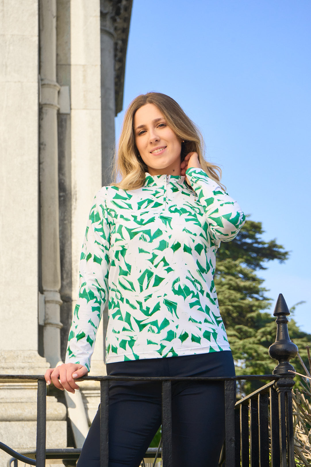 Presenting the Serenity Long Sleeve Ladies Golf Zip Top in Wild Peony Emerald - an elegant and luxurious option for stylish and high-end ladies golf apparel. This full zip top features a botanical print inspired by the Royal Parks, evoking a sophisticated and exclusive feel. Perfect for wearing on its own or as a mid layer, it offers a multitude of features to elevate your golf game. Experience the must-have addition to your golfing wardrobe with the Serenity Long Sleeve Zip Top.